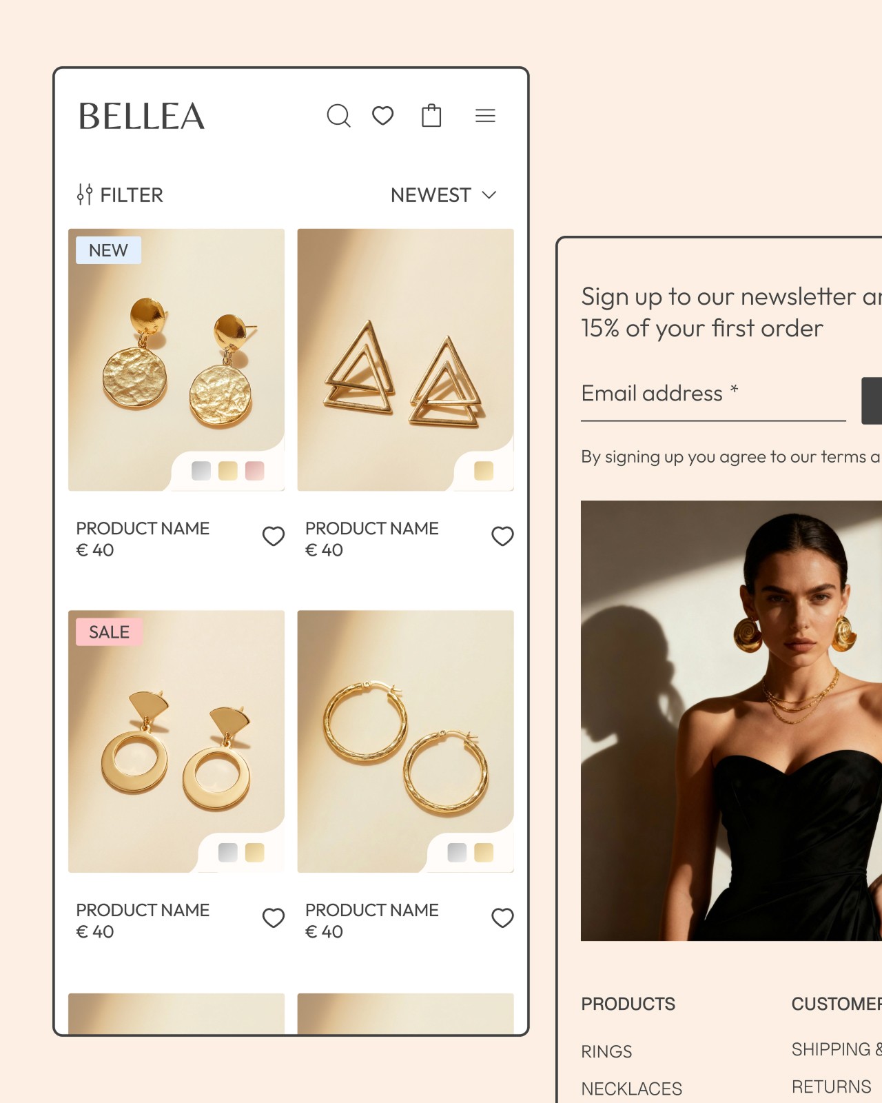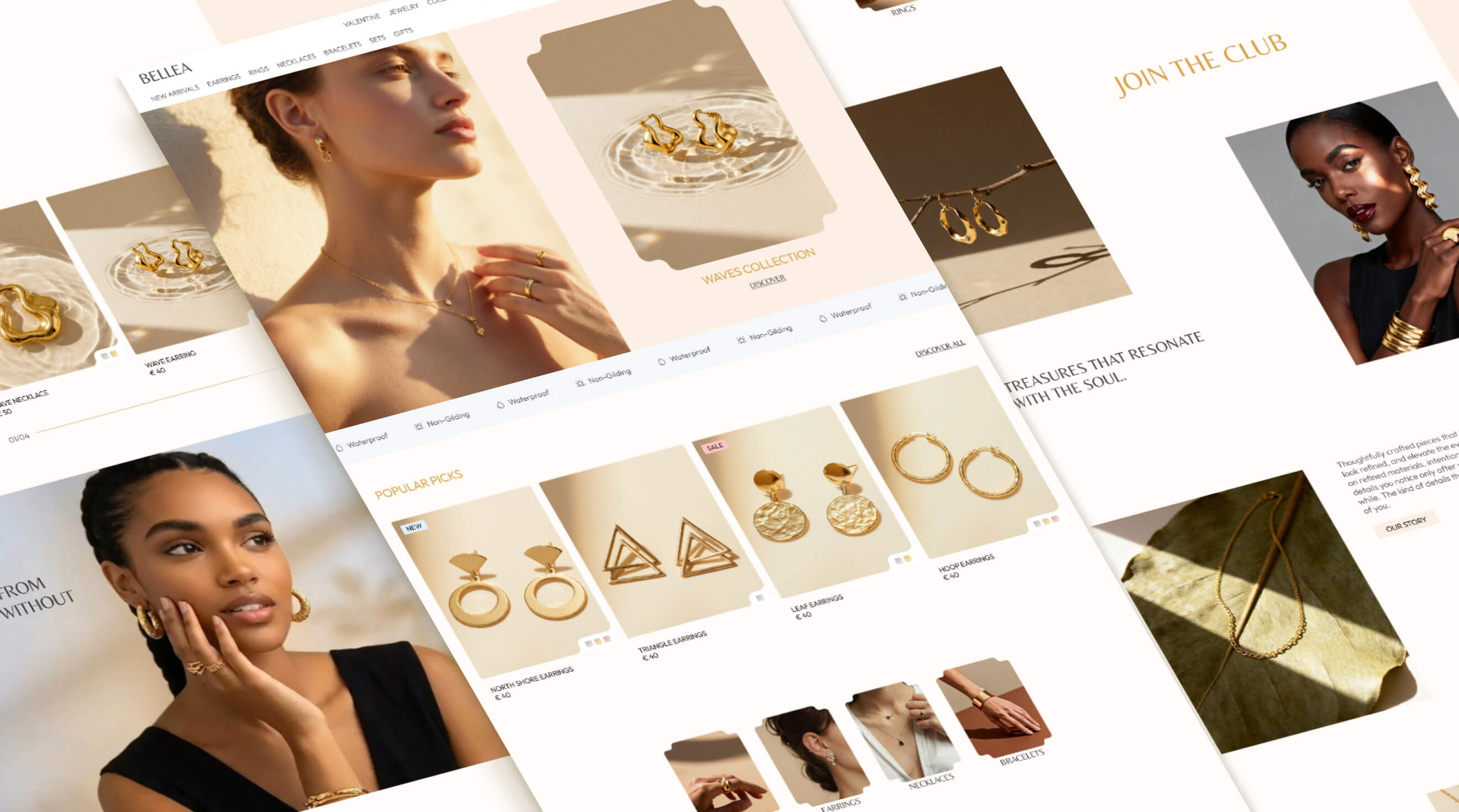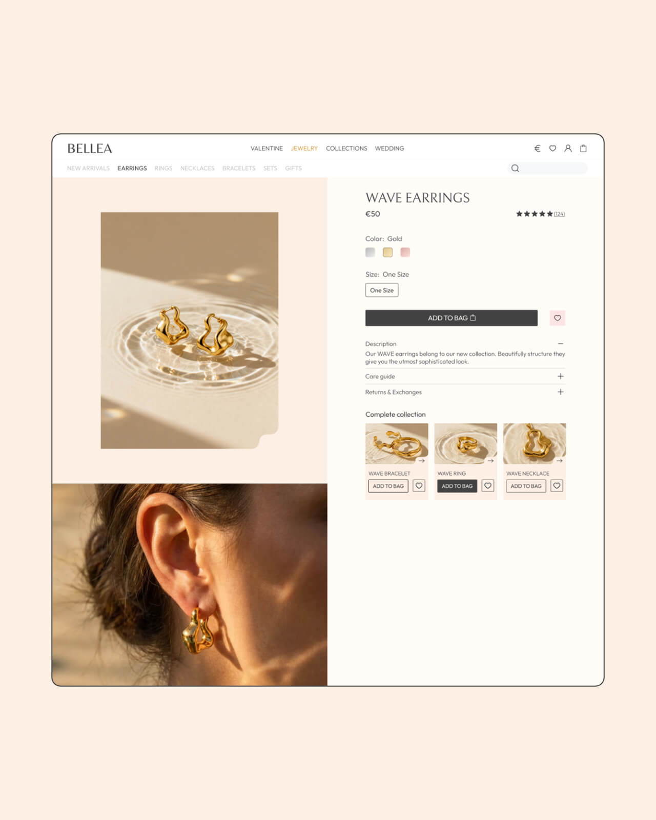 Imagery plays a central role. Close-up product photography highlights the craftsmanship of each piece while showcasing the jewelry on models helps the customer to better imagine what it feels like to wear these.
