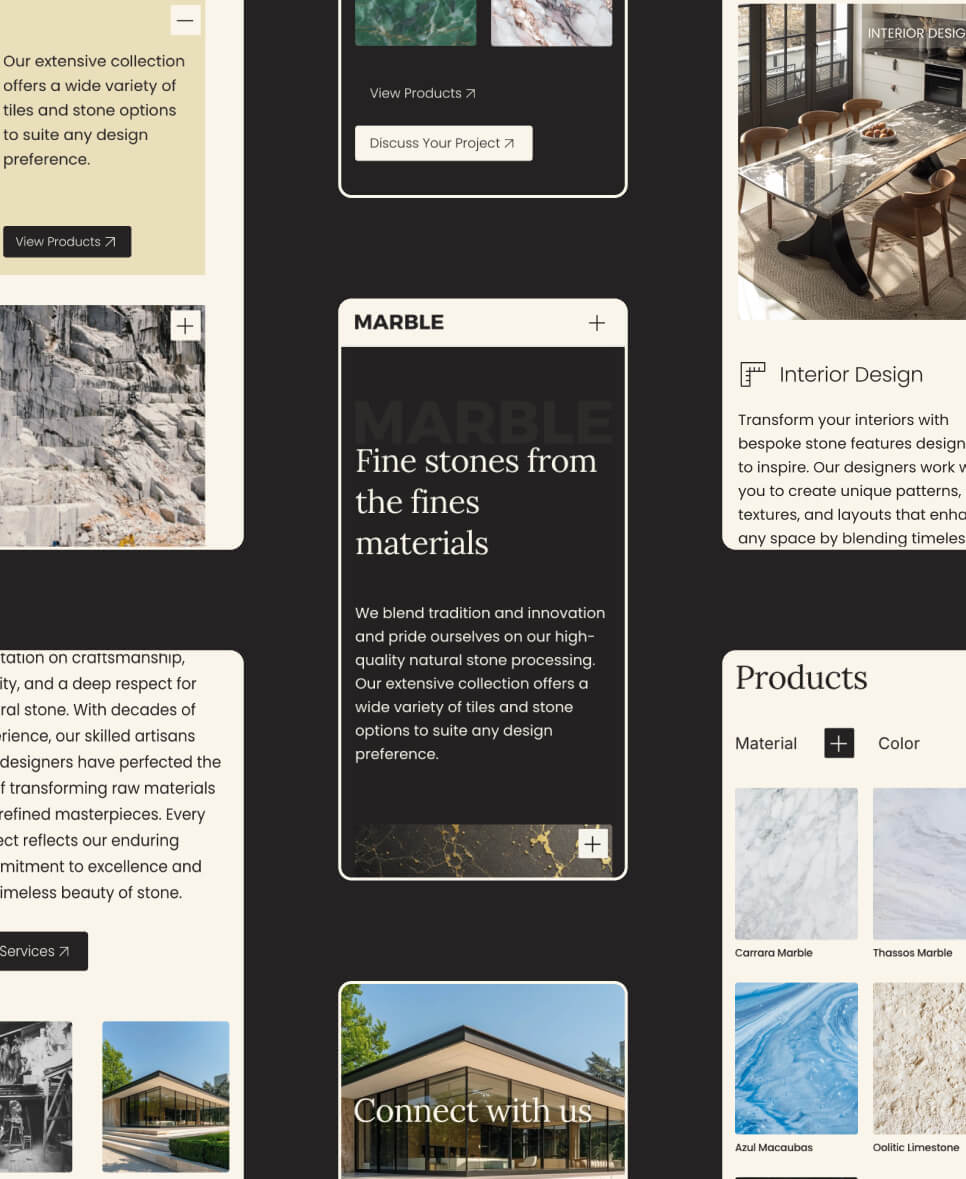 This project focused on crafting a modern, sophisticated website that reflects the elegance and precision of a stone brand. The design emphasizes a clean finessed layout showcasing products and services. The development process focused on the comparison of two platforms, prioritizing set up, responsiveness, and seamless user experience.